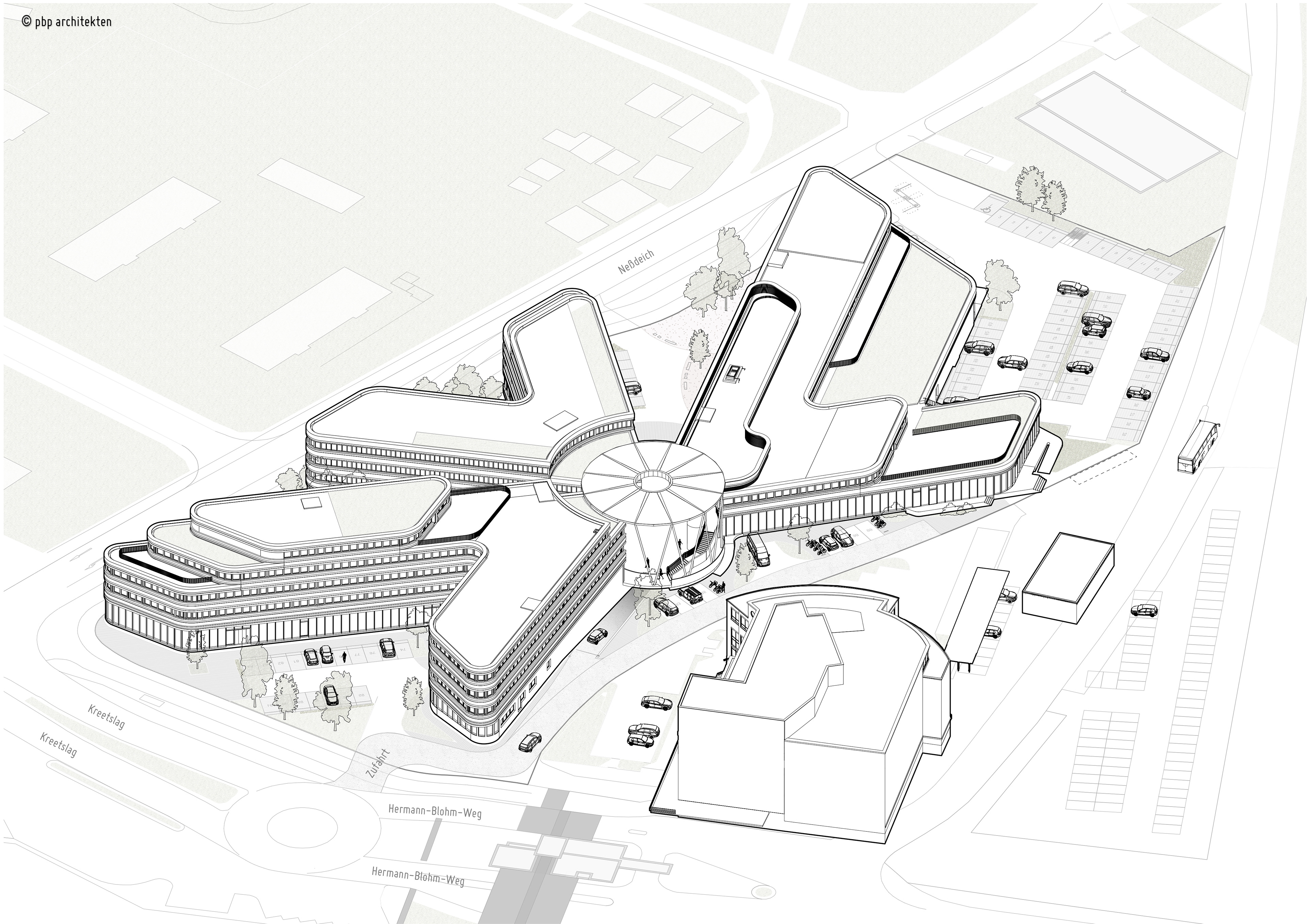 Im Süden von Hamburg in Finkenwerder entsteht ein neues Dienstleistungszentrum vor den Toren des Airbus Werkes. Der 20.600m² große Komplex bietet dem Stadtteil und dem Airbuswerk eine Vielzahl von Nutzungen: Nahversorger, Gesundheit, Flugsimulatoren, Gastronomie, Werksführungen und ein Hotel. Für Airbus entsteht ein neuer Showroom sowie viele neue Büro- und Meetingflächen. Durch den pbp Wettbewerbsgewinn wurde die Grundkonzeption des Komplexes festgelegt und dieser befindet sich zur Zeit in der Umsetzung, Fertigstellung ist im Sommer 2024 geplant.