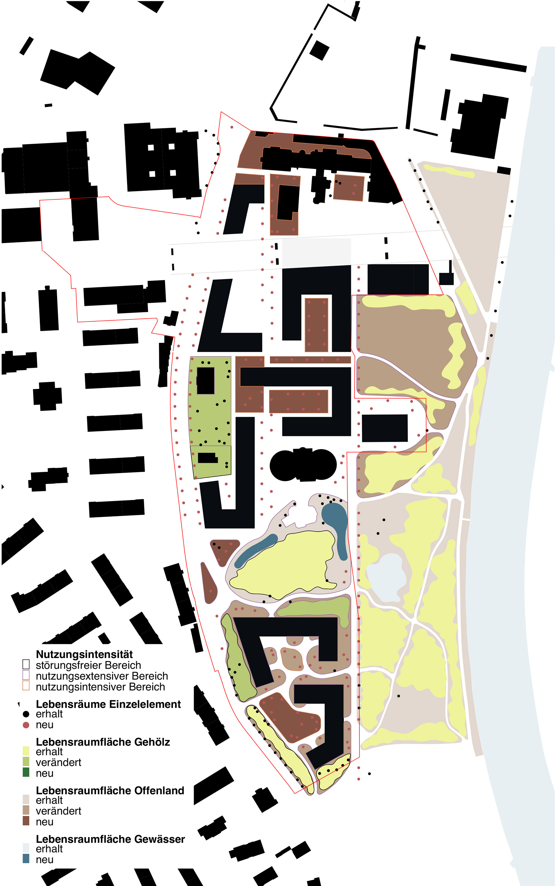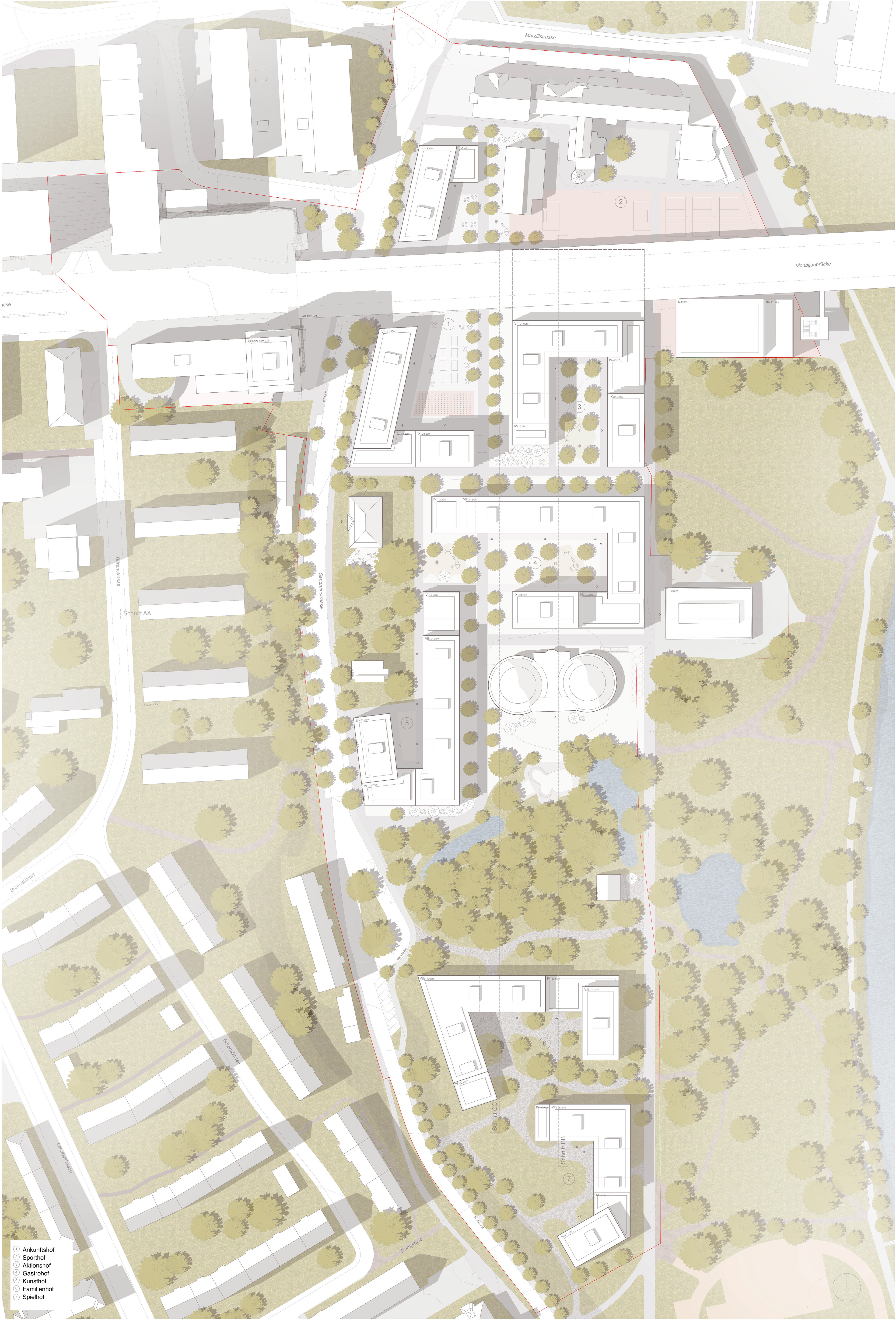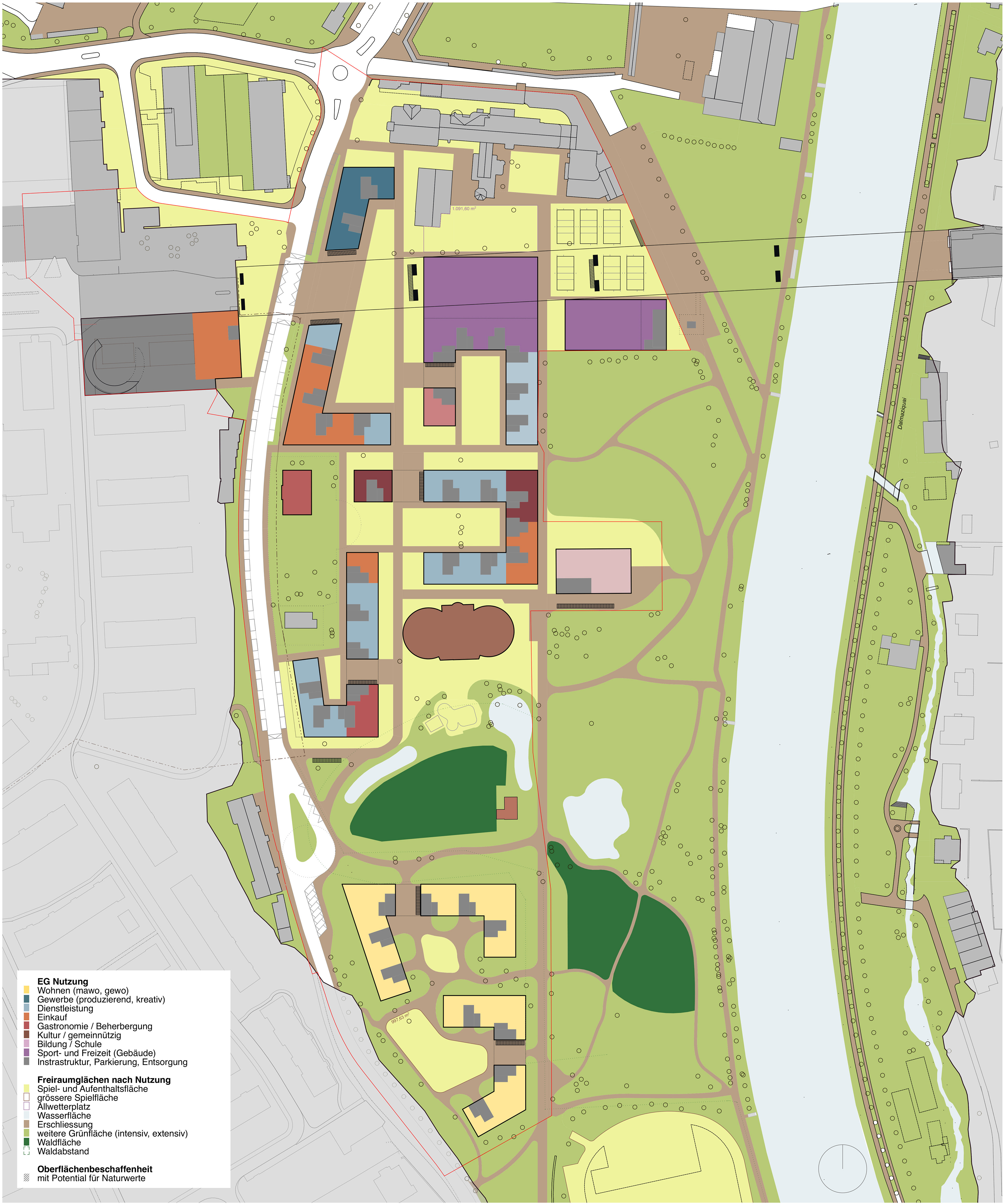 Die durch die U-förmige Bebauung entstehenden Höfe, bilden zusammen mit den Dachterrassen und den Plätzen der Bestandsgebäude den Charakter der sozialräumlichen Nutzung der entstehenden Siedlung. Insbesondere die Dachebene wird als zusätzlicher Lebensraum verstanden und ist als gemeinschaftliche Bespielungsfläche verstanden. Es entsteht unreglementierter Freiraum, der durch die Anwohner, das Gewerbe und die Kultur angeeignet werden kann. Der Freiraum bleibt nutzungsoffen und bietet insbesondere auch Platz für experimentelle, nichtkommerzielle Nutzung. Es entsteht eine Symbiose zwischen dem Kulturzentrum Gaskessel und dem sich im Erdgeschoss befindenden Gewerbe, sowie den Anwohnern und Anwohnerinnen. Das Gaswerkareal hat einen starken Bezug zu Wasser durch die Aare und das Marzilli. Ausgebaut wird diese charakteristische Eigenschaft durch zwei weitere Kammmolchweiler im Süden des Gaskessels und einem Wasserspiel im nördlichen Ankunftsbereich der Bebauung. Die Positionierung der Sportanlagen ist zum Marzilibad ausgerichtet und soll dadurch die neu entstehenden Sport- und Freizeitangebote mit den bestehenden Angeboten wie dem Outdoor- Workout, der Aare und dem Marzili einfach verbinden. Es entsteht eine Vertikalverbindung, welche die Schwemmebene mit der Stadt Bern im Bereich des Löifusses erschliesst. Die Sportanlagen bilden den Freiraum für die Naherholung der Siedlung und angrenzenden Quartiere sowie der Stadt Bern und des Kirchenfelds. Der Ankunftsbereich, die Dreifachturnhalle und die Beachvolleyballfelder befinden sich teilweise unter der Monbijoubrücke und sind somit vor starker Sonneneinstrahlung geschützt. Die Positionierung der Höfe ermöglicht eine natürliche Beschattung. Die nördlich gelegene Positionierung ermöglicht auch eine Konzentration der intensivierten urbanen Freiraumnutzung und bündelt die urbanen Lärmemissionen um die Monbijoubrücke.