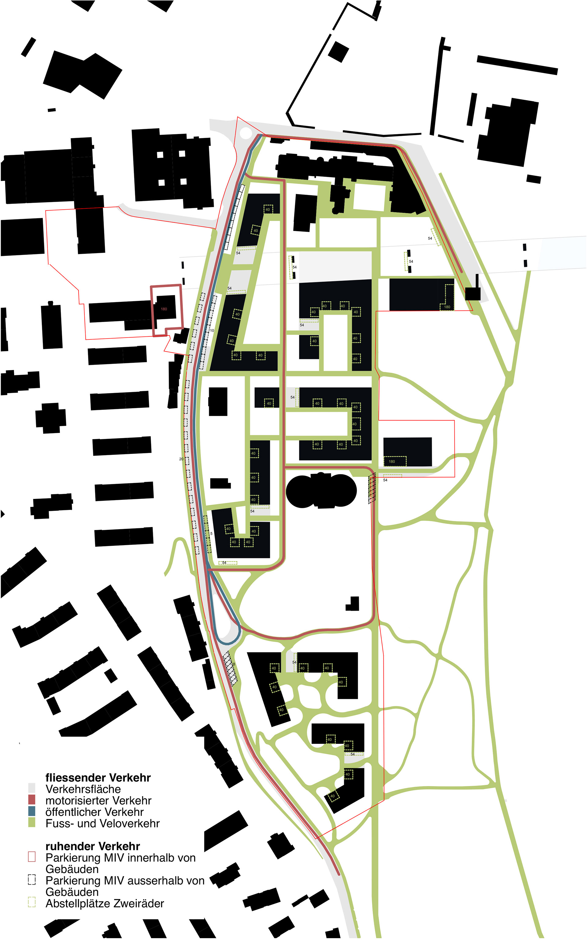 Ein differenziertes und kleinmassstäbliches Erschliessungkonzept sorgt für ein feinmaschiges Netz für den Fuss- und Veloverkehr, das auch die Anbindung an die umliegenden Gebiete gewährleistet. Das gesamte Gaswerkareal ist weitgehend autofrei ausgerichtet. Nachhaltige Mobilitätsformen sind geplant mit über 600 Veloabstellplätzen im Aussenraum inklusive öffentlichem Sharingangebot. Über 1800 Velos können in den Eingangsbereichen der Wohnkomplexe untergebracht werden. Entlang der Sandrainstrasse befinden sich im Schatten der Baumallee Autoparkplätze welche unter anderem für Carsharingorganisationen reserviert sind. 180 gedeckte Parkplätze werden im Sockel des Brückenkopfs untergebracht. Durch das Rückgrat des Areals ist eine Anlieferungsstrasse geplant. Die Strasse für den motorisierten Individualverkehr ist eine Einbahnstrasse welche bei der Ryffabrik beginnt, neben dem Gaskessel entlanggeht und und beim Eingang neben dem Wald mündet. Die Erschliessung bilden die nord-süd-verlaufende Mittelachse. Zusätzlich gibt es noch eine Ausnahmeroute für Notfallerschliessungen und den Tourbus. Dem Tourbus ist es erlaubt auf den Mitarbeiterparkplätzen des Gaskessels zwischenzuhalten und hat dadurch eine direkte Verbindung zum im Norden gelegenen Hintereingang des Gaskessels. Der nördliche und südliche Teil des Areals werden durch zwei Hauptwege erschlossen. Im Westen führt der Weg an der Bushalteschlaufe vorbei dem Rückgrat der Siedlung entlang und im Osten führt die Veloroute 8 direkt bis zur Ryffabrik und entlastet dadurch den Fussgänger vorbehaltenen Weg der Aare entlang.