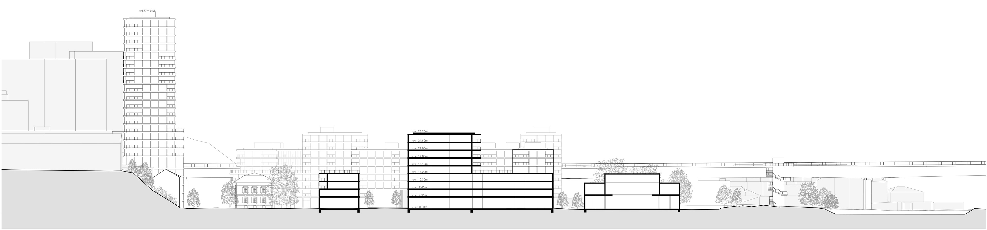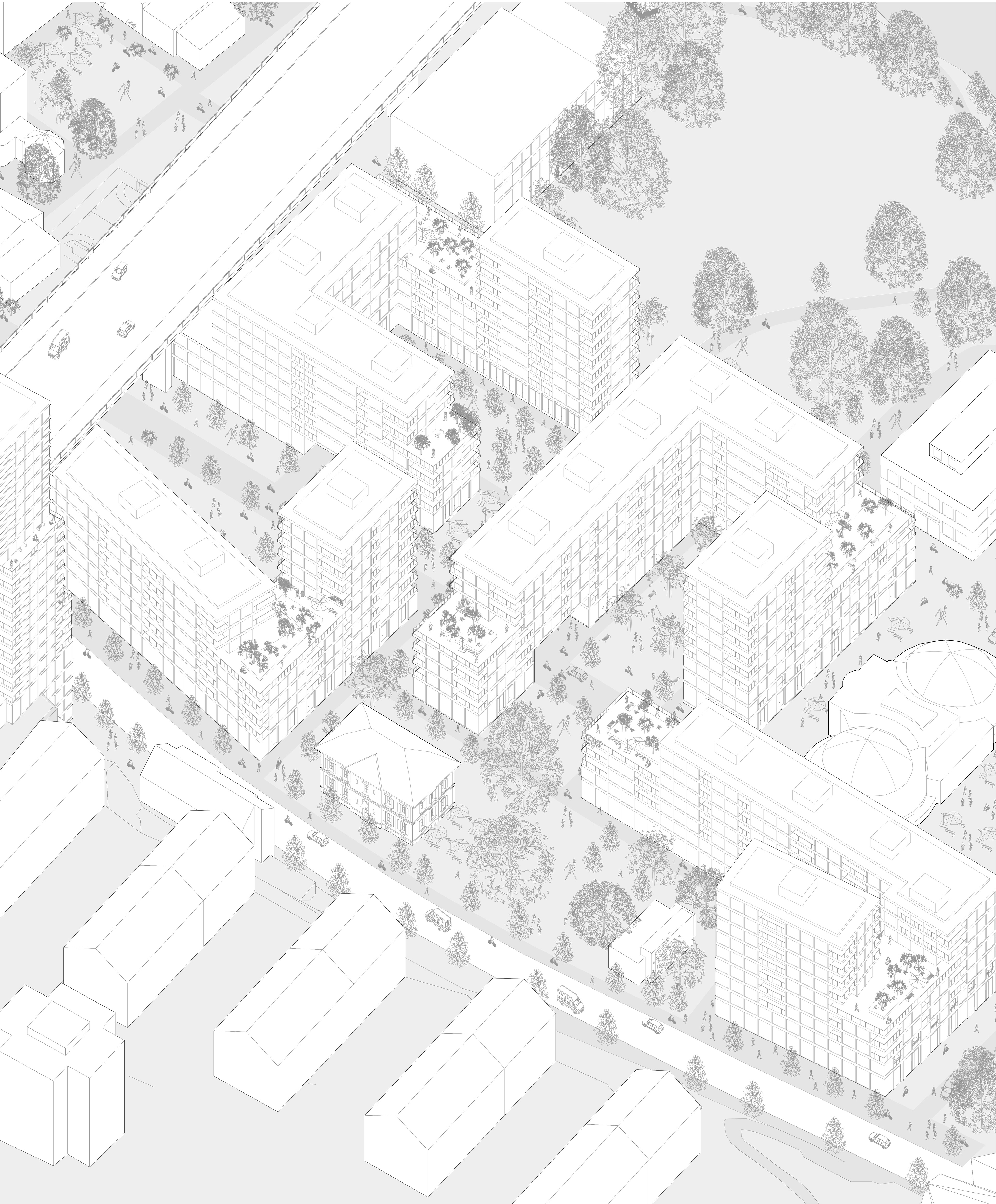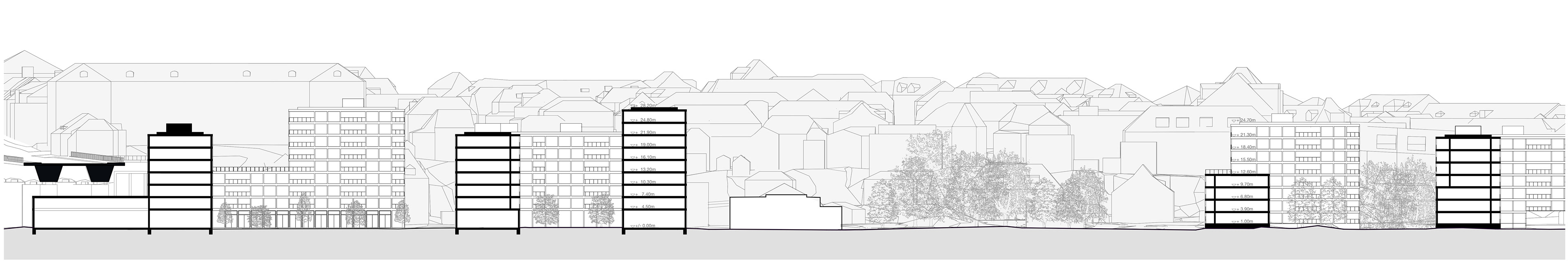 Das grundsätzliche stadträumliche Ordnungsprinzip im Gaswerkareal orientiert sich an der einseitig geöffneten Hofbebauung. Die unterschiedlichen U-förmigen Baukörper umfassen dreiseitig einen Stadtraum, der sich jeweils auf einer Seite mit dem übrigen Quartier räumlich und funktional verbindet. Dieses System erlaubt ein flexibles Reagieren innerhalb des Areals und gleichzeitig die räumliche Vernetzung auf den bestehenden Kontext. Die Bestandsbauten werden in das urbane Konzept einbezogen und der angrenzende Naturraum wird funktional mit den Hofräumen verflochten. Die vertikale Gliederung der geplanten Gebäude erlaubt unterschiedliche Situationen bezüglich Dichte und eine Anpassung an die Gebäudehöhen des Bestands. Die turmartigen Aufbauten werden zum Erkennungsmerkmal des Areals und erlauben qualitativ hochwertige Wohnungen. Durch die Abstaffelung der Gebäudehöhen entstehen vielfältige Aussenräume auf den Dachterrassen, welche für alle Bewohner zugänglich sind. Die Variabilität in der Vertikalität und Horizontalität führt zu genau differenzierten Bereichen mit grosszügigen Freiflächen einerseits und dichten urbanen Situationen andererseits, was der Verflechtung innerhalb des Areals von Stadt und Natur entspricht. Der Brückenkopf wird gestalterisch als vertikale Variante des gleichen Themas wie im Gaswerkareal behandelt, indem die Gebäudevolumetrie durch eine vertikale Staffelung eine feine Gliederung erfährt und der Bestand möglichst erhalten bleibt.